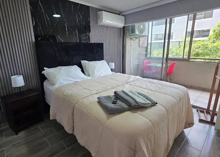 The 1-room Apartamento Acogedor Con Ubicacion Estrategica En Las Condes Santiago lies just 0.8 km from the Sky Costanera Tower and nearly 5 minutes' walk from Tobalaba tube station. The 45 m² apartment offers private car parking on site and modern comforts like Wi-Fi.